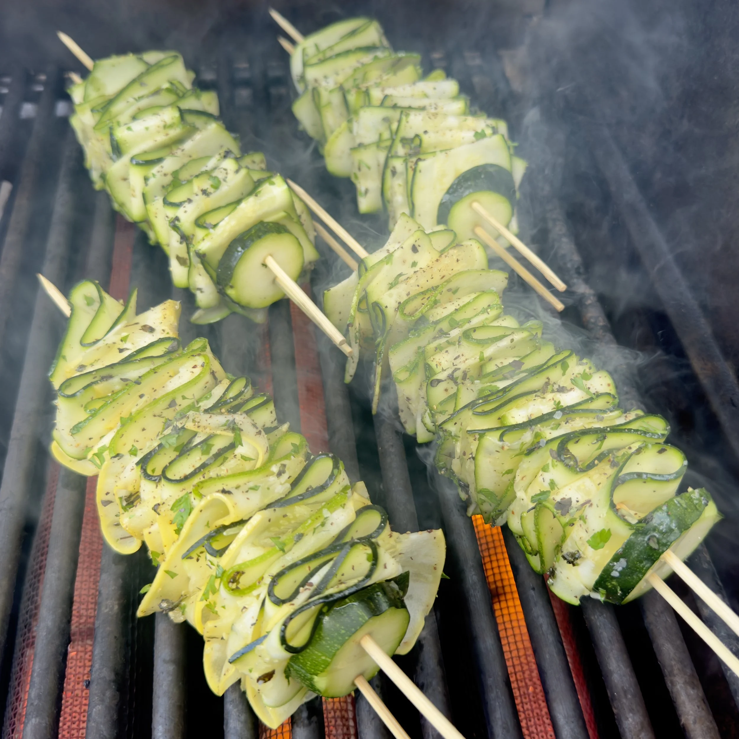 The problem with most grilled zucchini is the high moisture content makes it hard to get nice dark grill marks, and the final product often ends up limp and soggy. We’ve solved that problem by slicing our zucchini into thin ribbons and weaving them onto bamboo skewers so the thin edges cook quickly and develop a nice char without leaving you with a soggy squash.