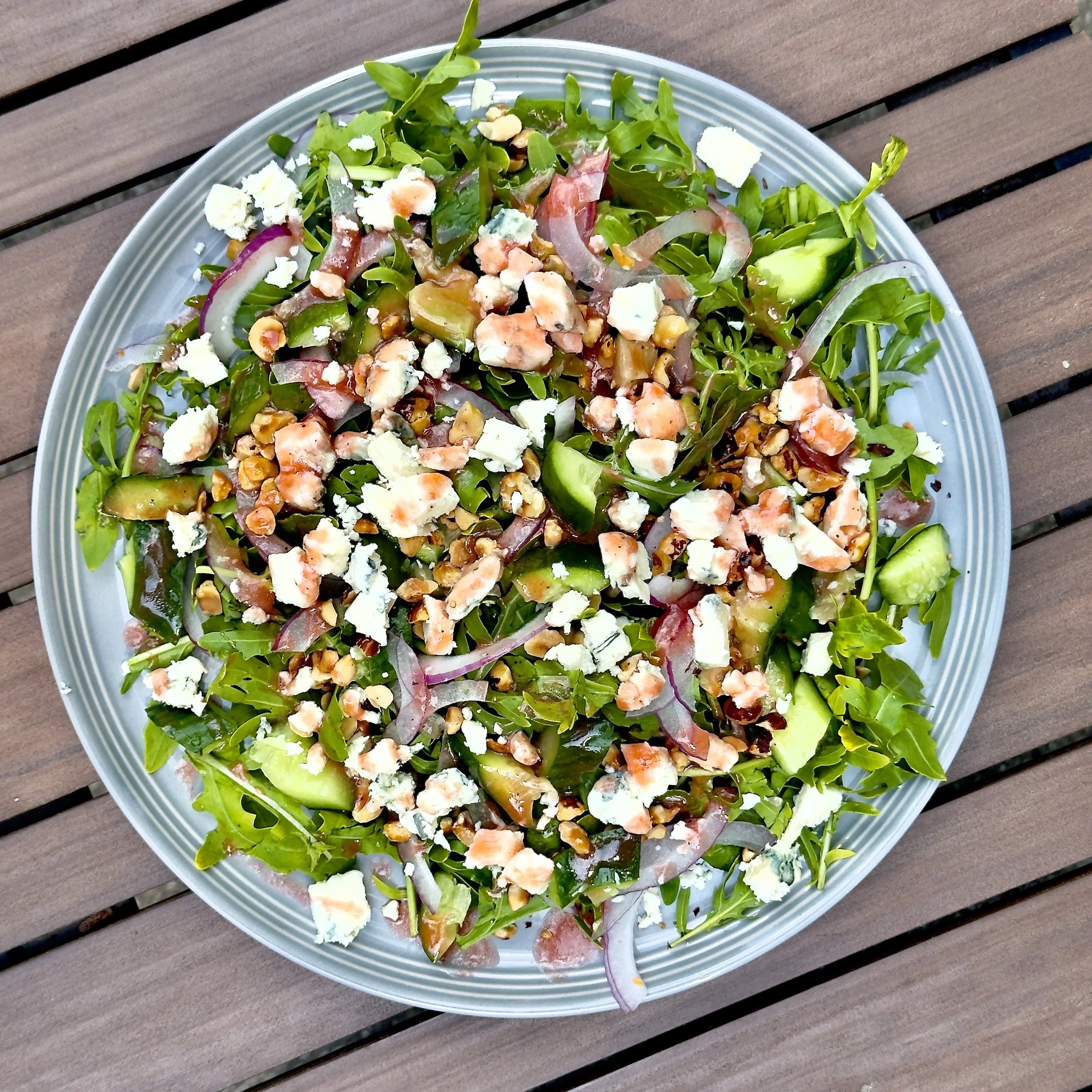 The slightly spicy, super nutty flavors of Arugula pair perfectly with this sweet-tart Raspberry vinaigrette. Along with the salty-funkiness of the Blue Cheese (Honestly, any salty, tangy cheese would work well here: Blue, Feta, Goat, etc, but we especially love Blue Cheese in this salad) and toasty crunch of Toasted Hazelnuts, it’s a perfect mid-summer salad, honoring all the good stuff growing right now in our garden.